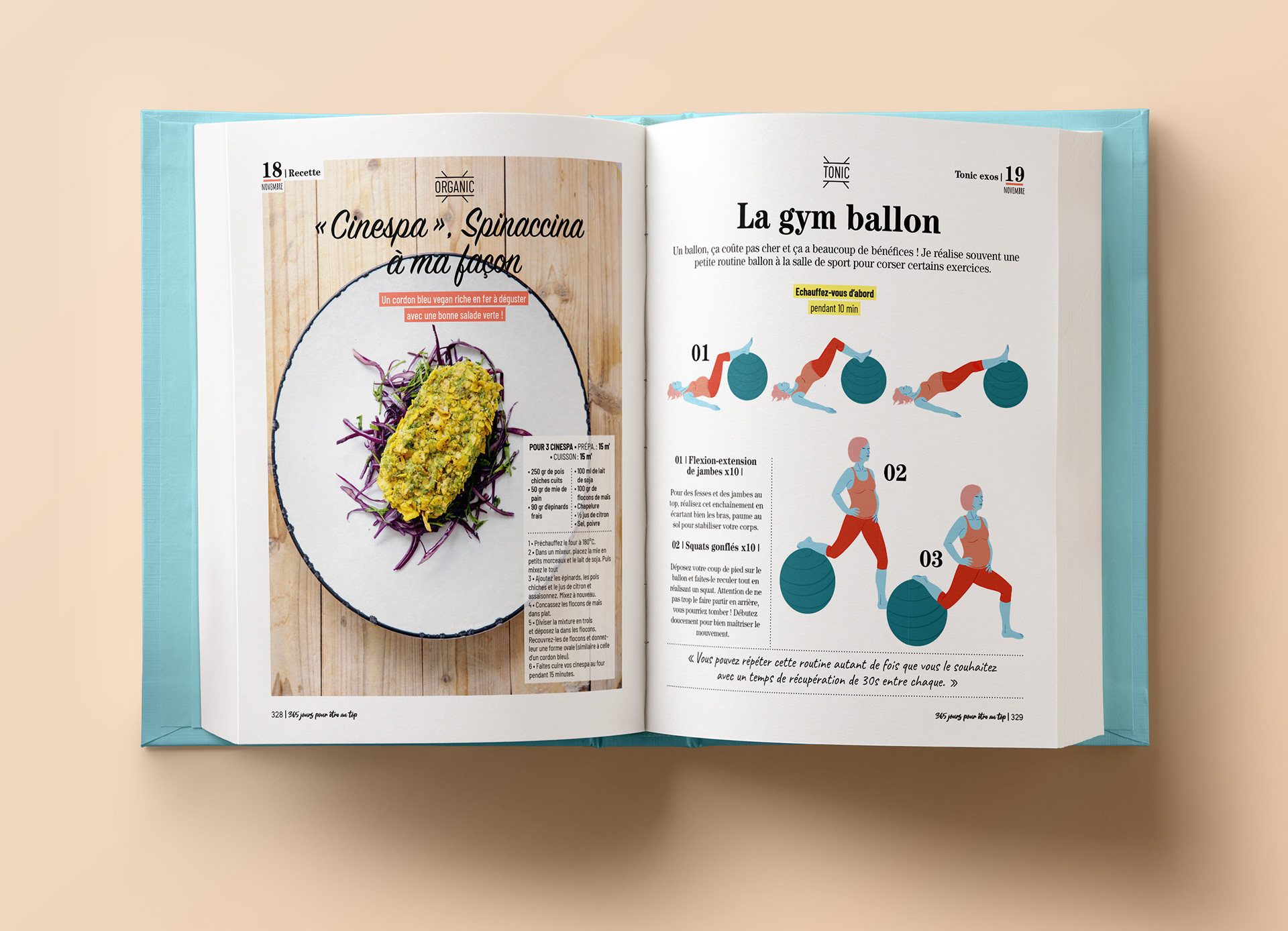 Projet collectif dans lequel la conception graphique et la mise en page du livre "365 jours au Top!" de Laury Thilleman, par Charlotte Calament. Illustrations des exercices de sport par Hina Hundt. Publié chez First Editions.